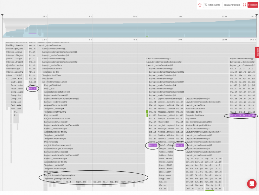 That’s where Blackfire comes in. Install Blackfire on your dev environment. Next to that, install also the chrome plugin so you can trigger profiling of the page. Don’t forget to put Magento into production mode and optimise the composer autoload file or you can get significantly different results. Open the page that runs slow, click on Blackfire and voila – you get the performance profile of the page. Open the timeline view and check what is taking so long.