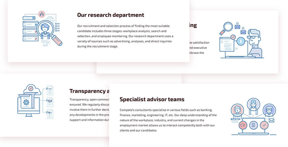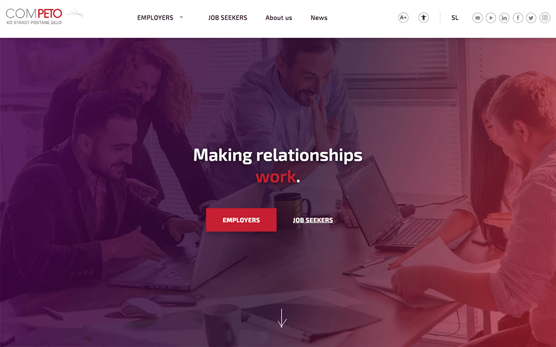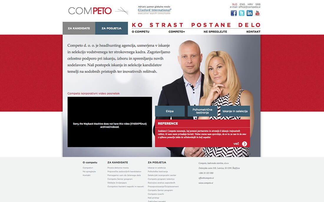 Competo is a consulting company, specialized in search and selection of executive professionals, HR consulting and people development. In Slovenia, Competo is a leading company in its field, so they decided to give a fresh look to their current website and to highlight their competitive advantages and present the company, its main services and the values of its employees in a modern and attractive way.