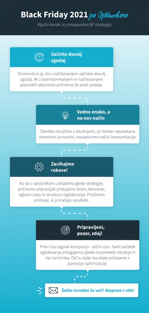 Oglaševalci vsako leto znova staknejo glave v upanju, da bodo našli odgovor na prastaro vprašanje: kdaj začeti z oglaševanjem za črni petek? Žal vas moram takoj razočarati, saj enotnega odgovora ni. Včasih je “rana ura tudi zlata”, spet drugič pa se čarovnija začne odvijati tik pred zdajci – v zadnjem tednu pred črnim petkom. Sami se stvari najraje lotevamo počasi in previdno, pri tem pa se nenehno zavedamo, da črni petek resda traja le en dan, a so lahko njegovi pozitivni učinki opazni še dolgo. Zato se vedno posvetimo tudi naslednjim korakom: