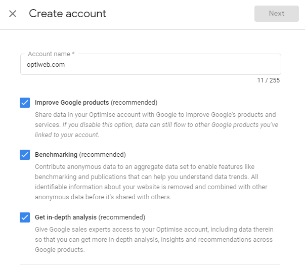 1. korak: ustvarite uporabniški račun za Google Optimize in identifikacijsko kodo