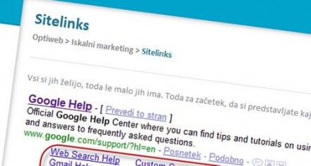 Sitelinki, kot jih bom od sedaj naprej poslovenil, so nekakšni predlogi, kaj lahko na strani še najdemo, poleg iskane ključne besede, in sicer nam te predloge poda google, na osnovi njegovih algoritmov. Google jih poda zato, da bi se mi lažje znašli, ter da nam prihrani čas iskanja prave informacije.