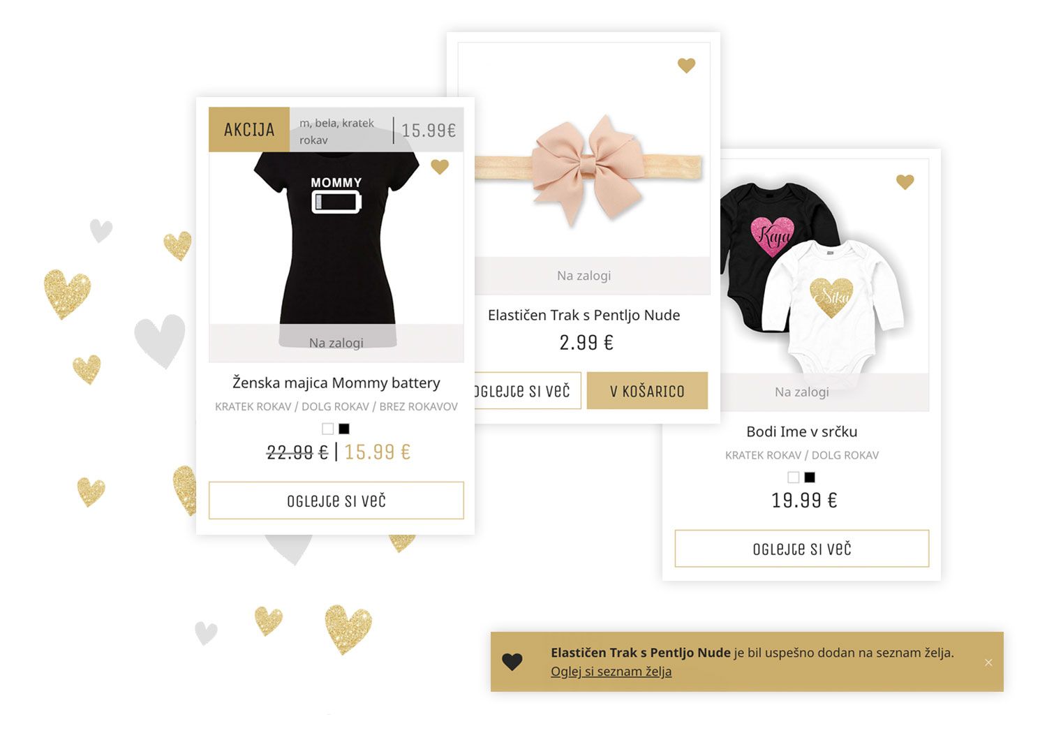 Zato smo na stran dodali pregleden seznam želja, s katerim lahko uporabnice na enostaven način označijo všečne izdelke in jih s tem shranijo na enem mestu. Ob zaključku svojega raziskovanja pa s pomočjo seznama lažje sprejmejo odločitev katere izdelke bodo zares dodale v svojo košarico.
