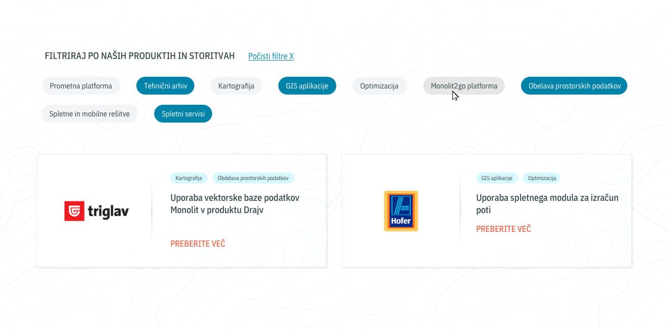 Uporabnikom smo omogočili, da lahko filtrirajo študije primerov po Monolitovih storitvah in tako iščejo samo po študijah primerov, ki ustrezajo njihovemu zanimanju.